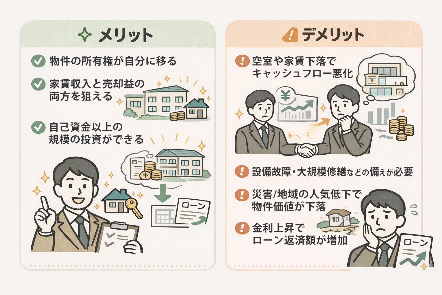 しかしその分、空室や家賃下落が続くと、ローン返済が重くのしかかるなど、ダウンサイドも大きくなりやすい投資です。