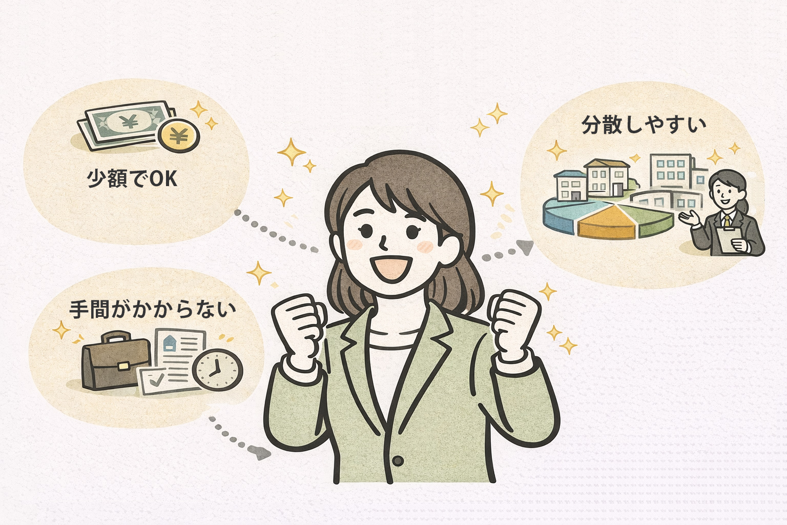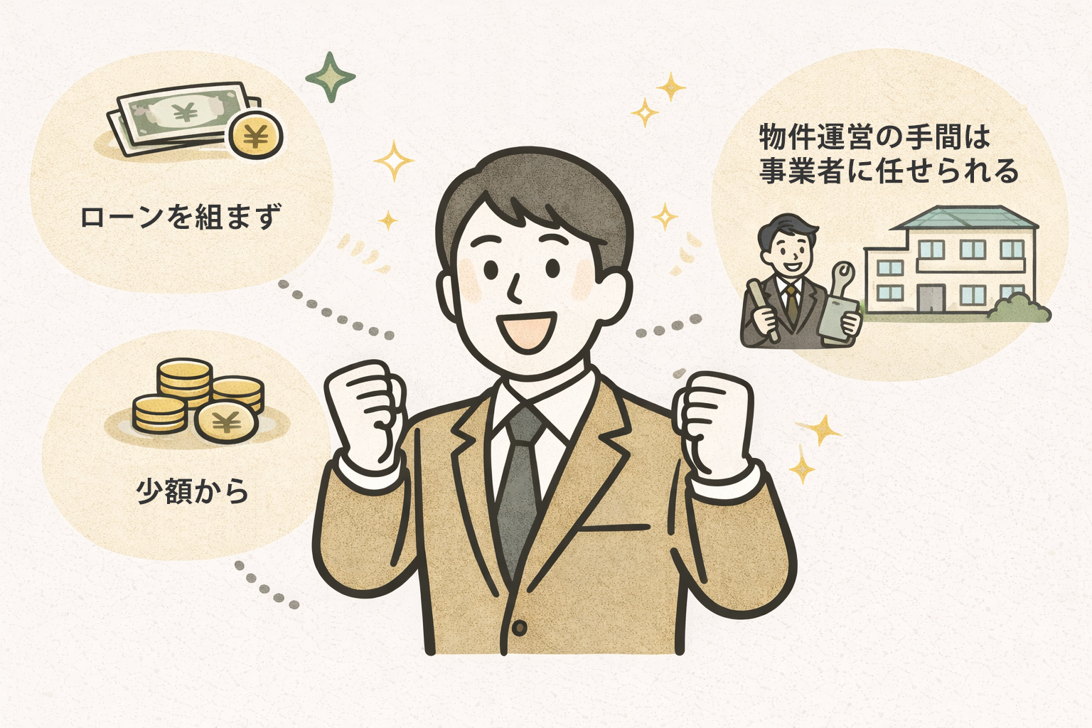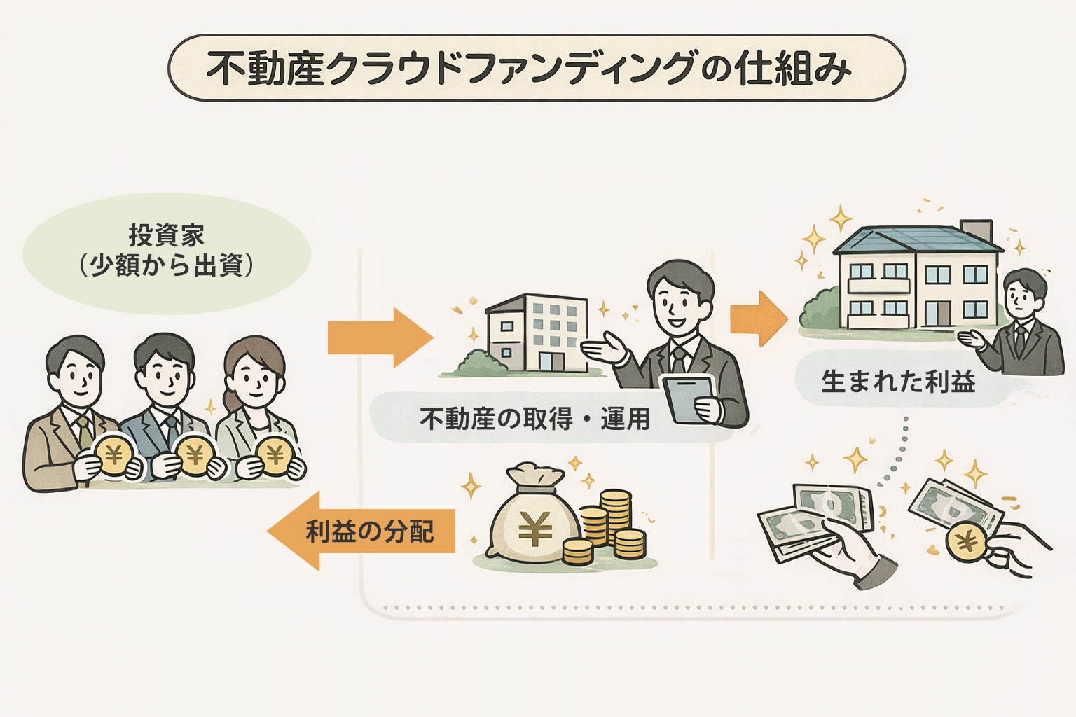 より正確には、「不動産を取得・運用する事業(スキーム)に少額で出資し、その事業から生まれた利益を分配してもらう」仕組みです。