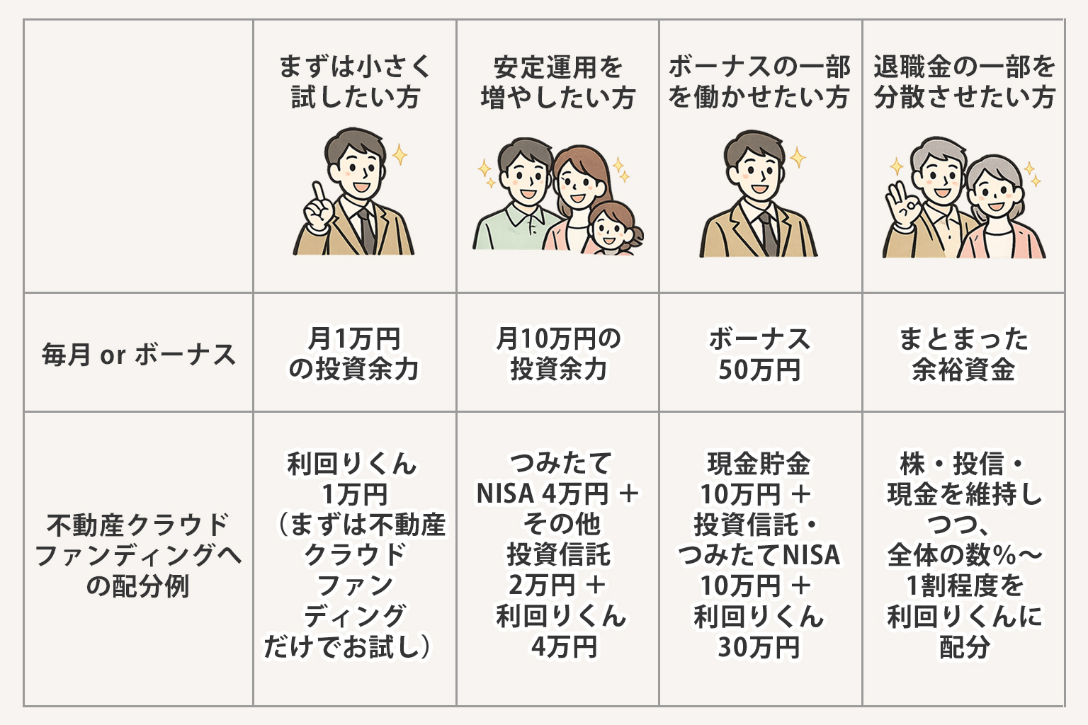 △ | ◎ | いきなりローンを組むより、 まずは不動産クラウドファンディングで 収益の感覚をつかむのが現実的 |